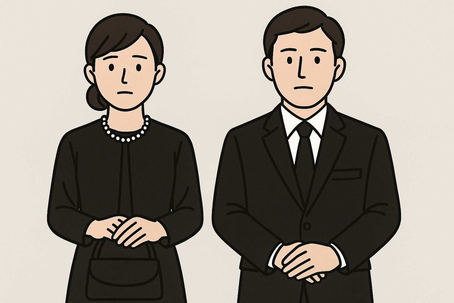 男性は光沢のない黒の礼服(白シャツ・黒ネクタイ・黒靴下・黒靴)、女性は黒のワンピースやアンサンブルに黒ストッキング。バッグや靴は艶控えめで金具が目立たないものを。家族葬や自宅法要でも主催側は一段格を上げると全体が引き締まります。