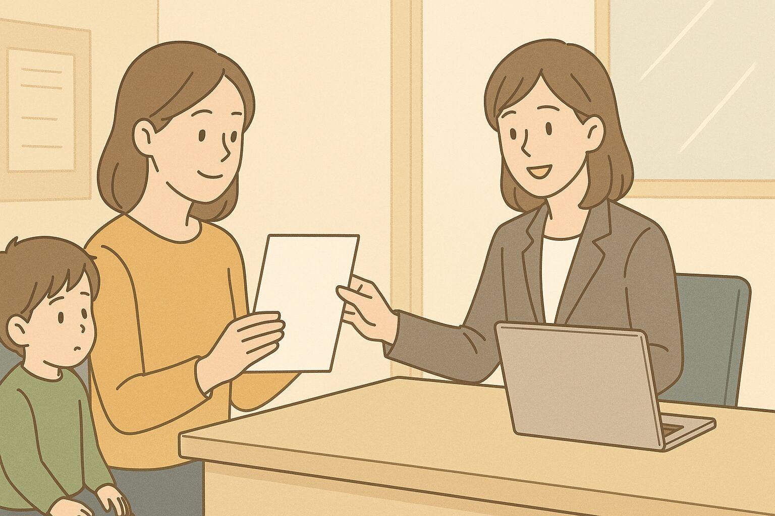 入口で番号札を取り、順番が来たら窓口で書類を提出します。最初の関門は「必要書類が全部そろっているか」。ここで不足があると受給資格の判断ができず、出直しになることがあります。